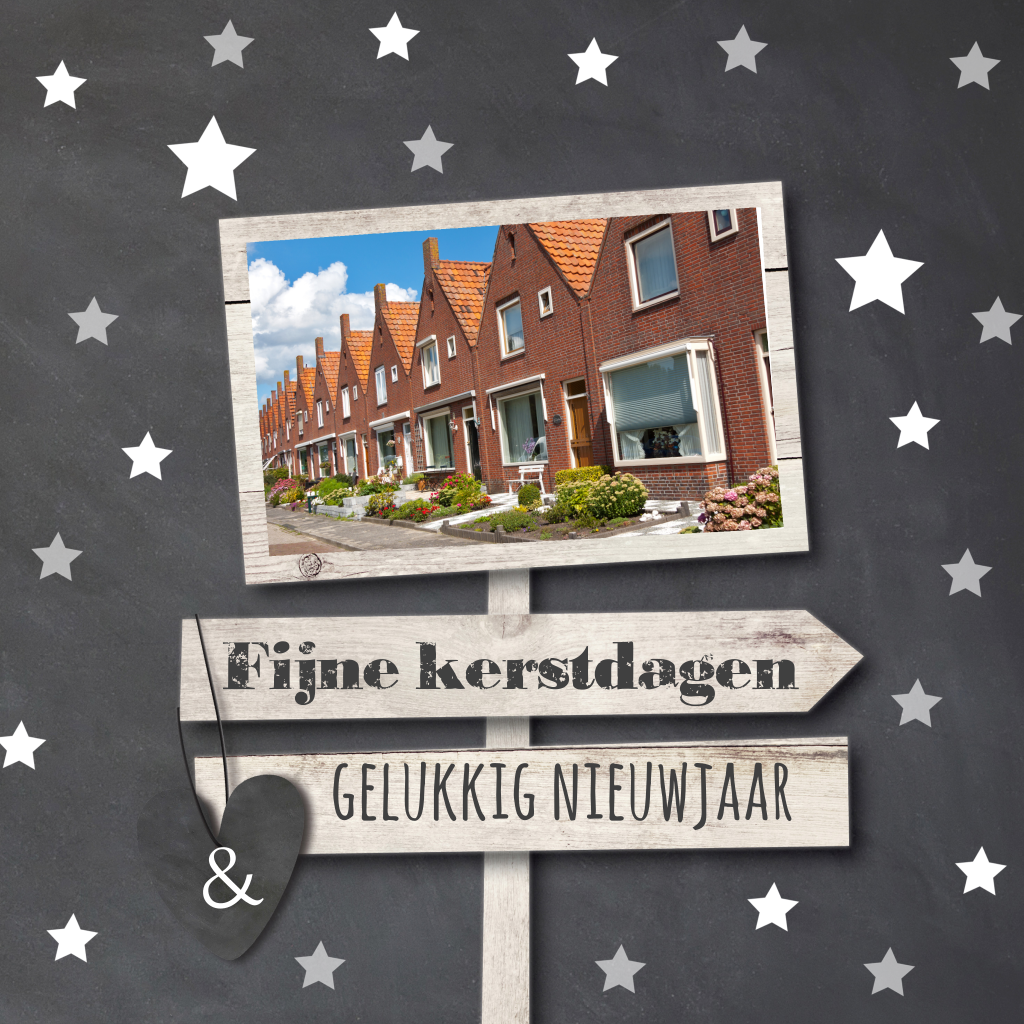 Combi verhuiskaart kerstkaart krijtbord met sterretjes en houten bord. Met ruimte voor een eigen foto. (2332)