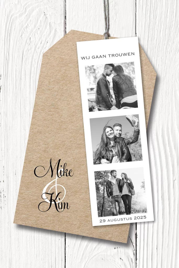 Mooie trouwkaart met wit gekleurd hout en fotostrip