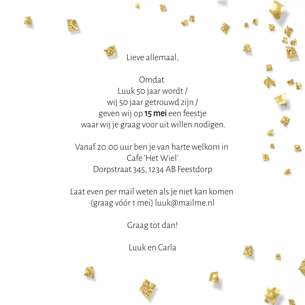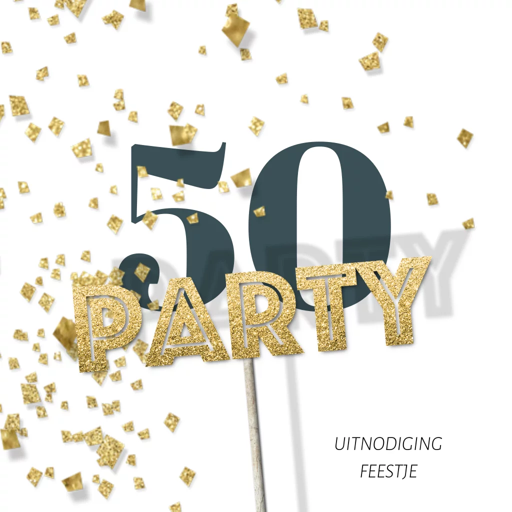 Uitnodiging voor een 50e verjaardag of een jubileum. De goud look spetters geven de kaart een extra feestelijke uitstraling. (24093)