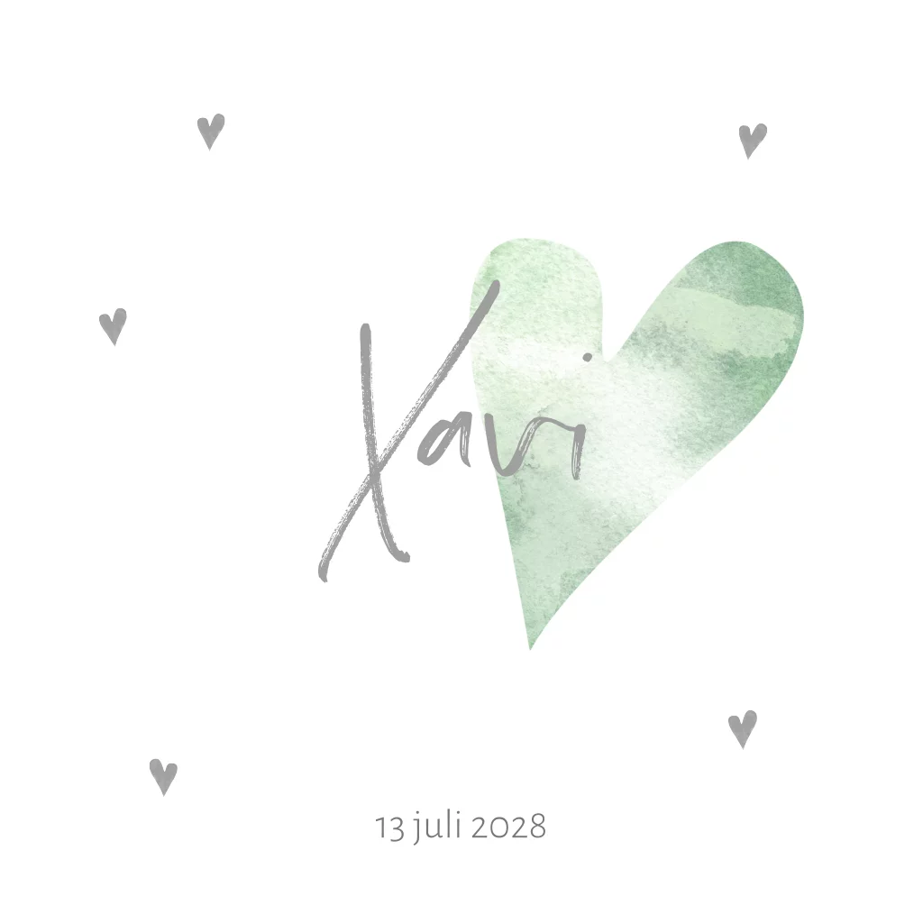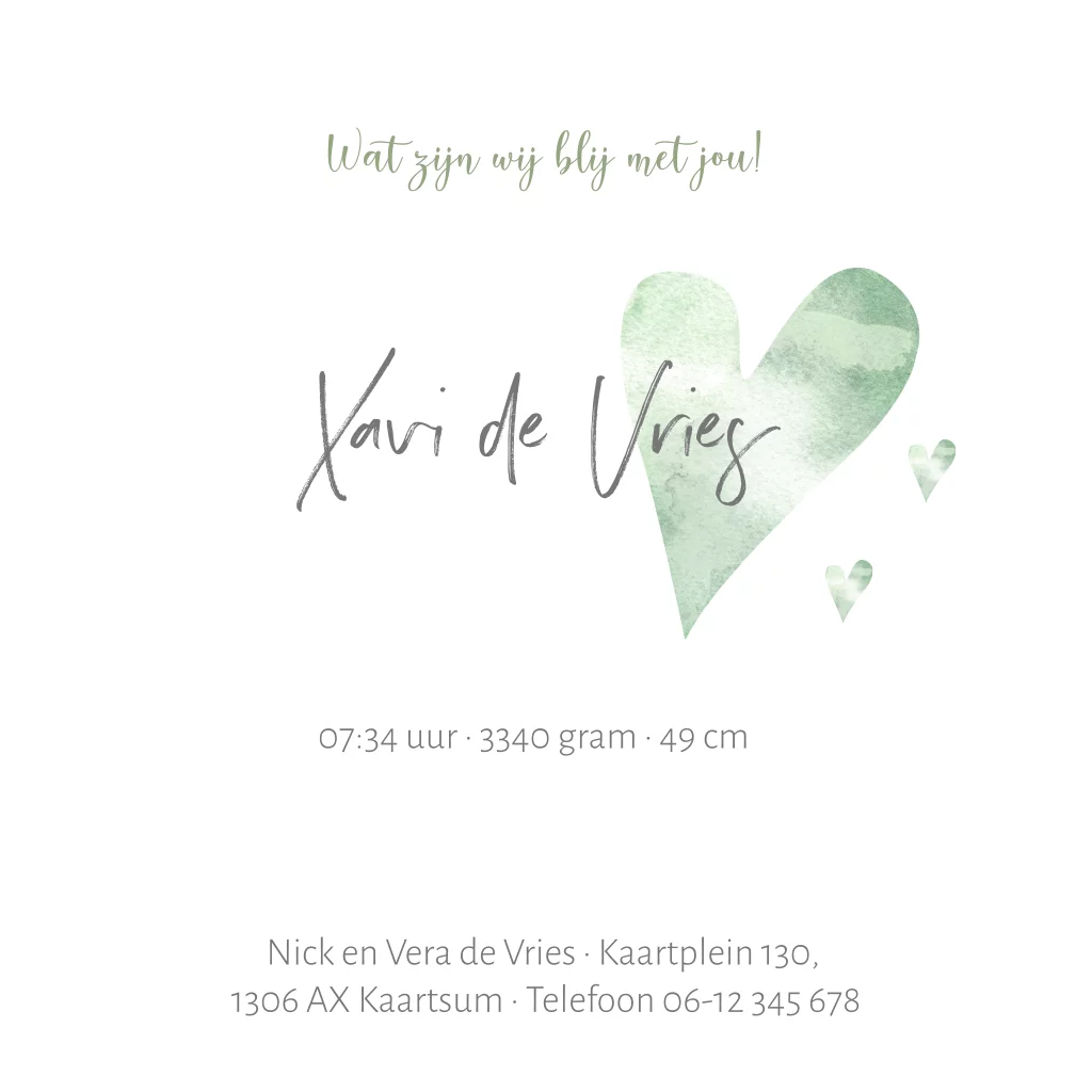 Geboortekaartje jongen met groot groen watercolor hart. (23862)