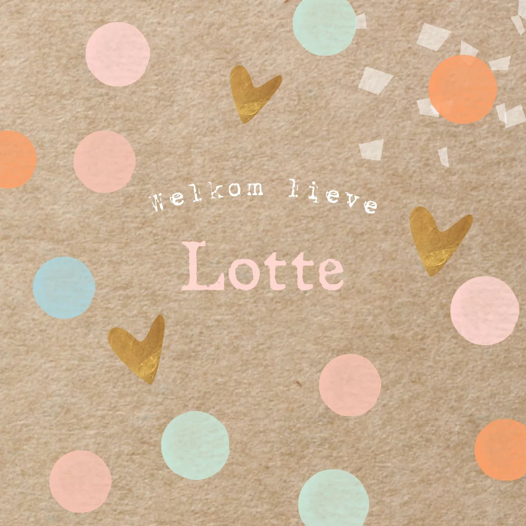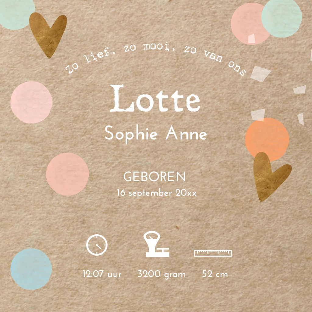 Geboortekaartje meisje met kraft-look op de achtergrond en confetti in frisse vrolijke pastel kleuren. (6949)