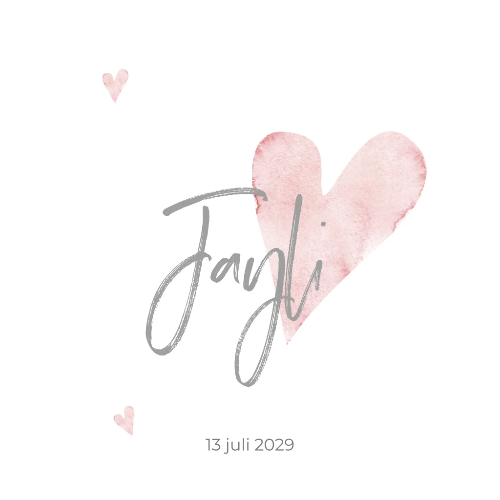 Geboortekaartje meisje met groot roze hart. (9975) Deze kaart is nu voorzien van ronde hoeken (meerprijs € 0,30). Wil je rechte hoeken? Zet het om bij achtergrond in de kaartenmaker.