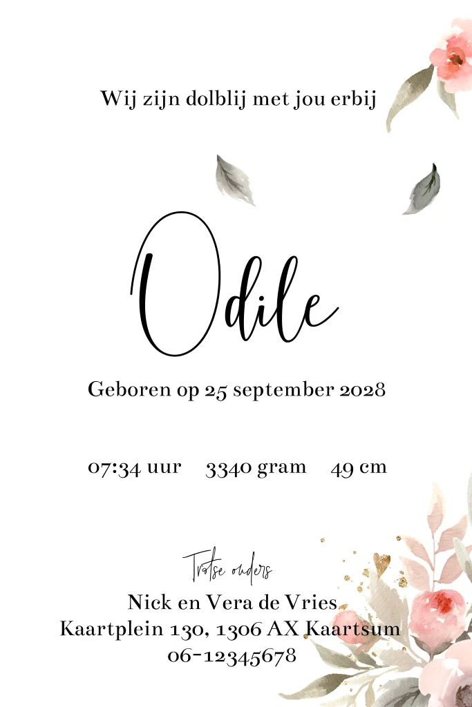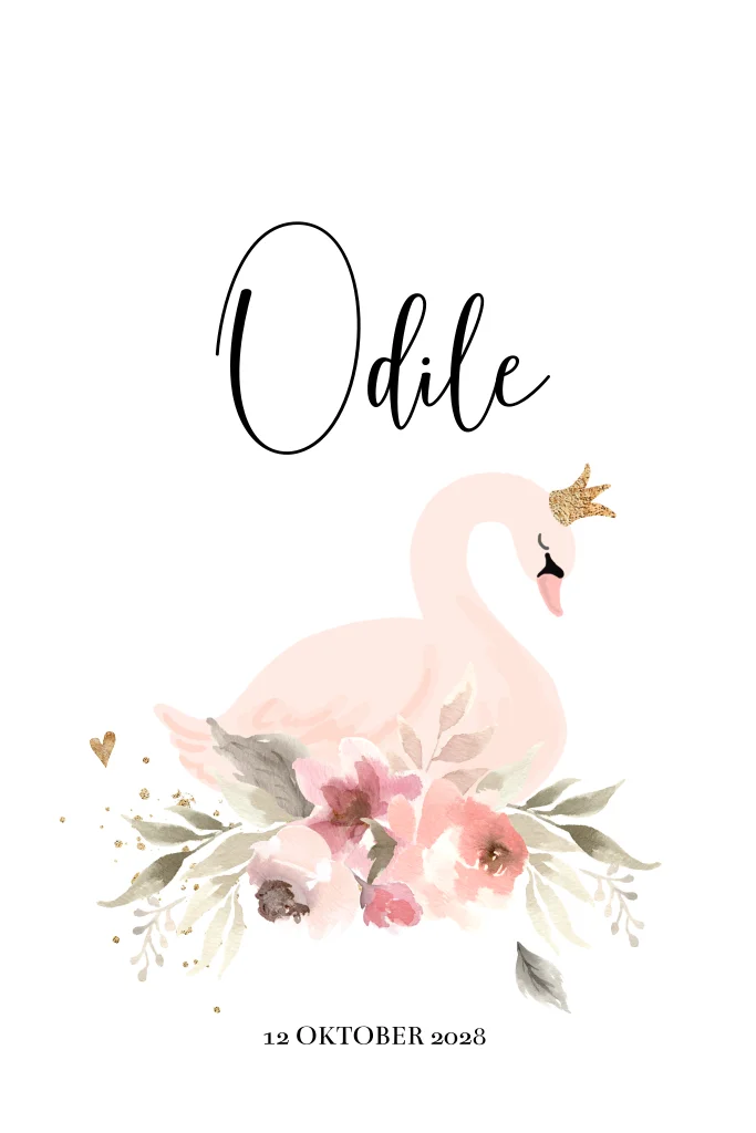 Geboortekaartje meisje met een handgetekende zwaan tussen bloemen met een kroontje. (9968)