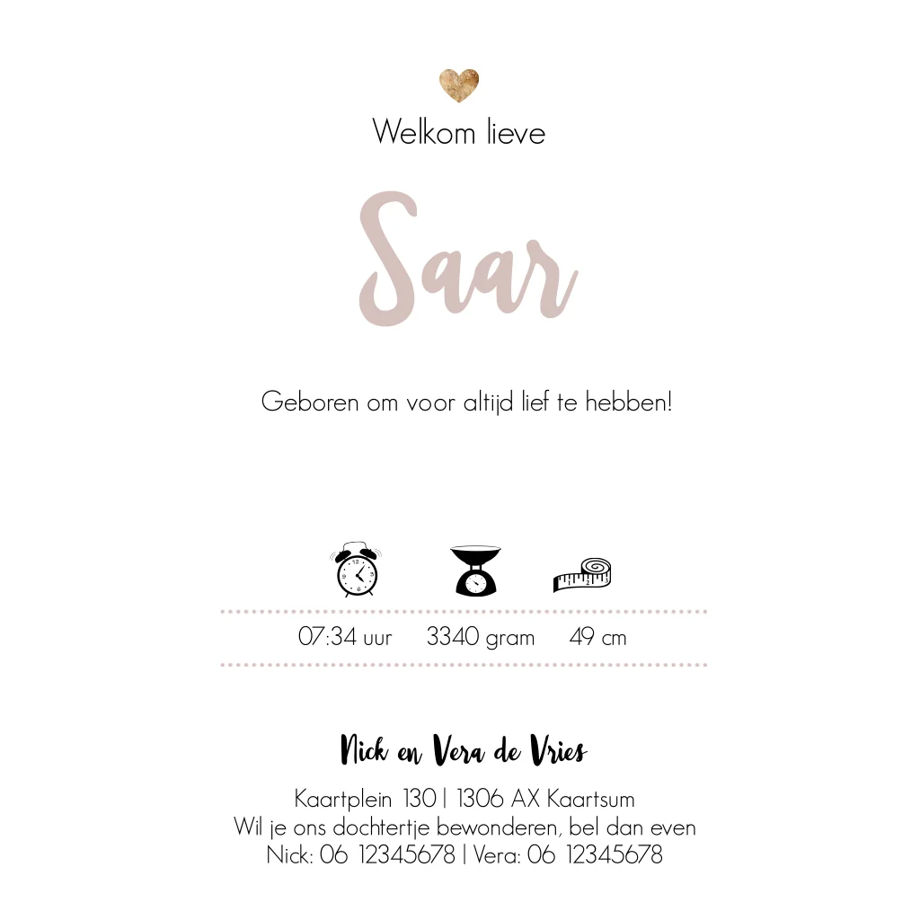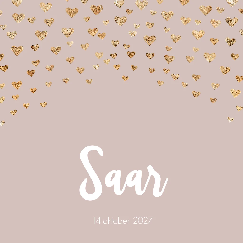 Geboortekaartje meisje oud-roze en goudlook hartjes hartjesregen van boven (9964) Geboortekaartje Saar