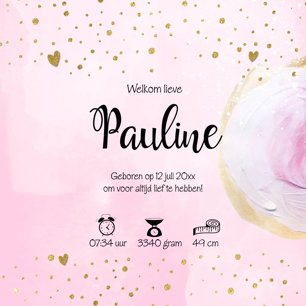 Geboortekaartje meisje met roze glitter goud look. (6961) Dit is een hip kleurrijk geboortekaartje met verf en goud look confettit