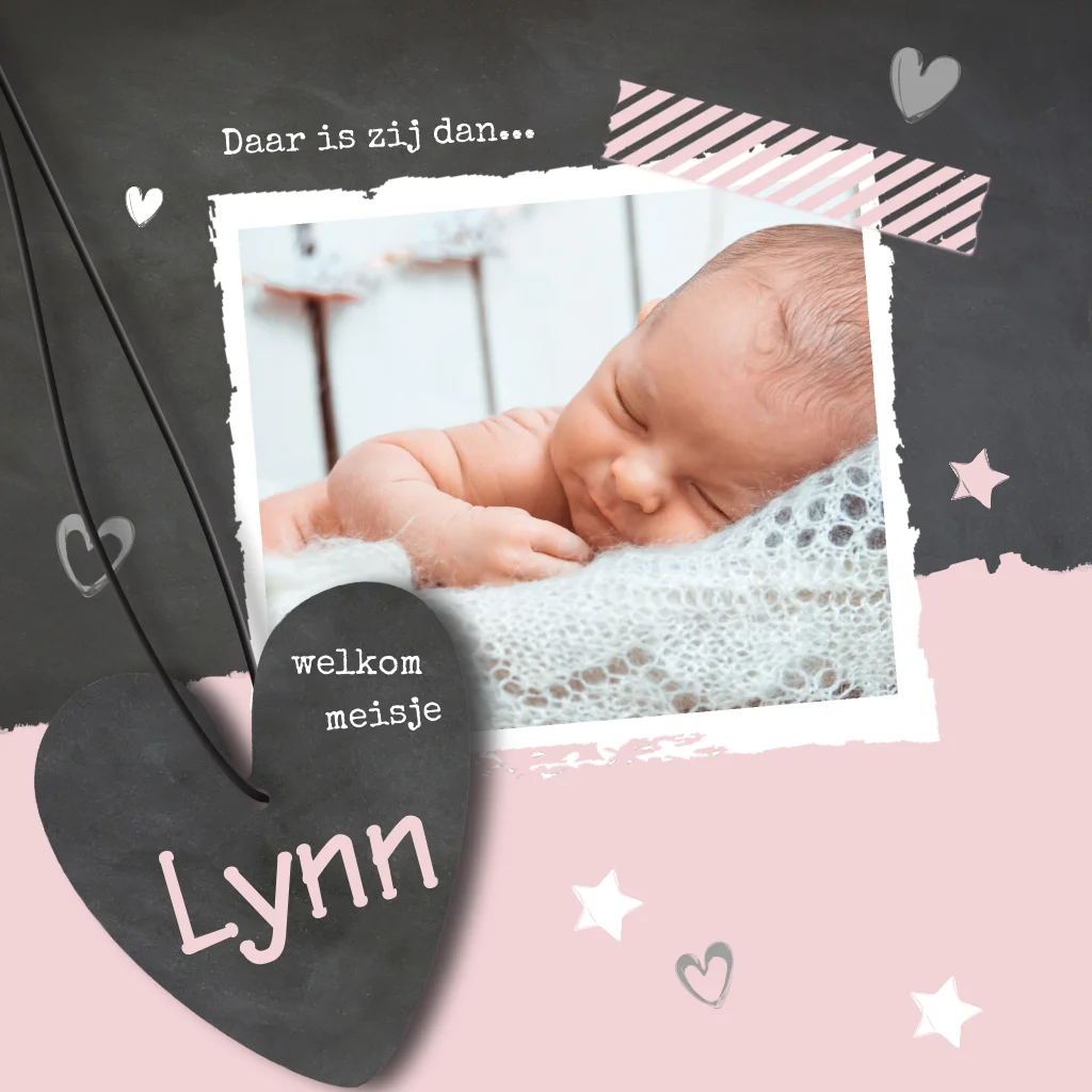 Geboortekaartje meisje schoolbord met print hartjes label in roze. Met eigen foto. (1678)