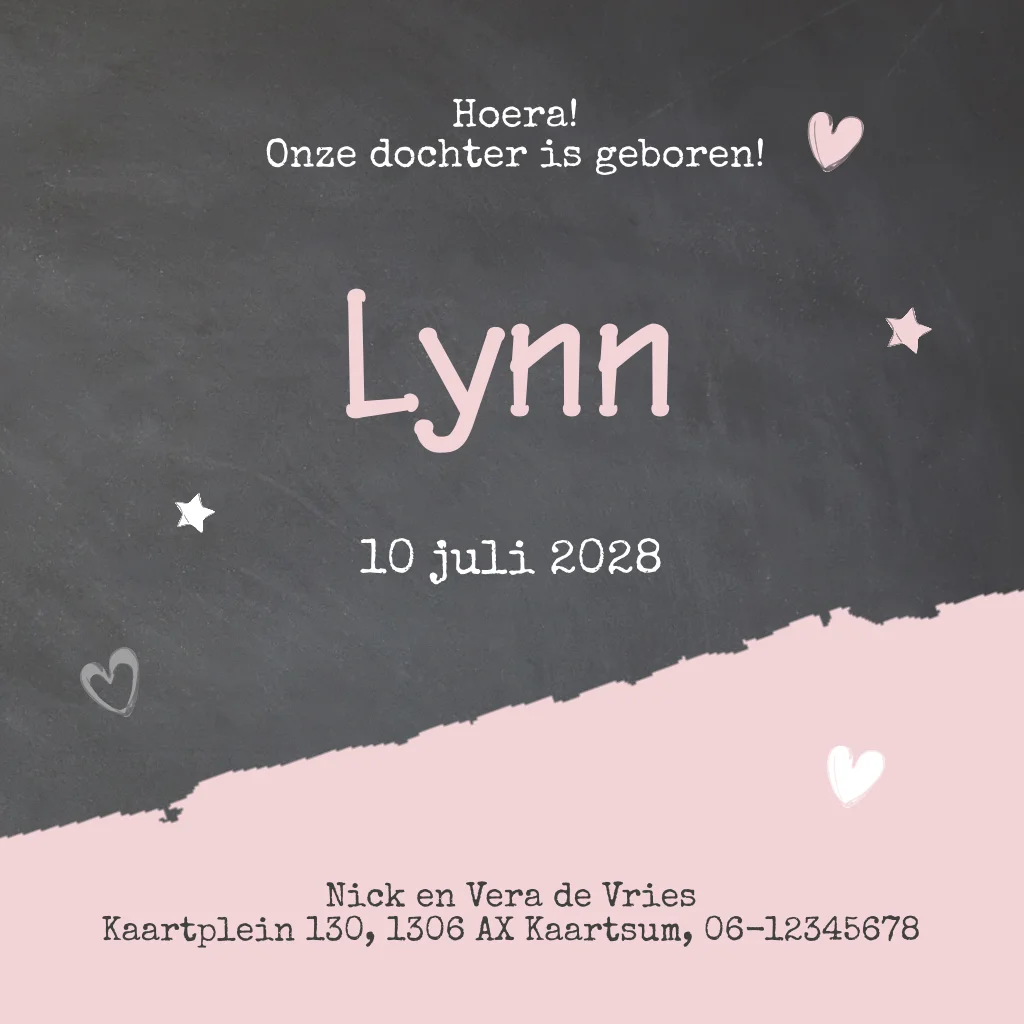 Geboortekaartje meisje schoolbord met print hartjes label in roze
