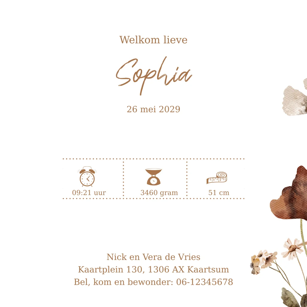 Geboortekaartje met geschilderde bloemen en eigen foto