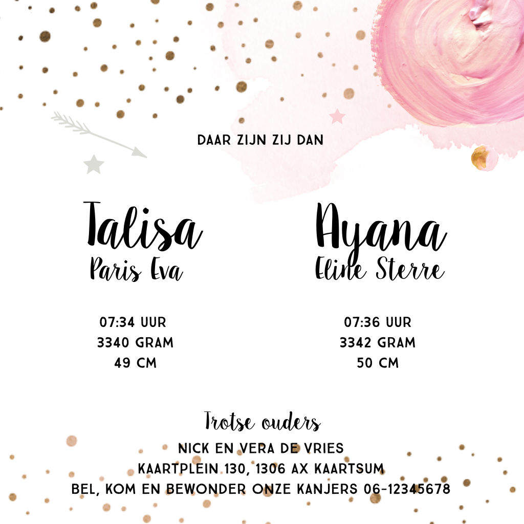 Lief geboortekaartje tweeling met aquarel