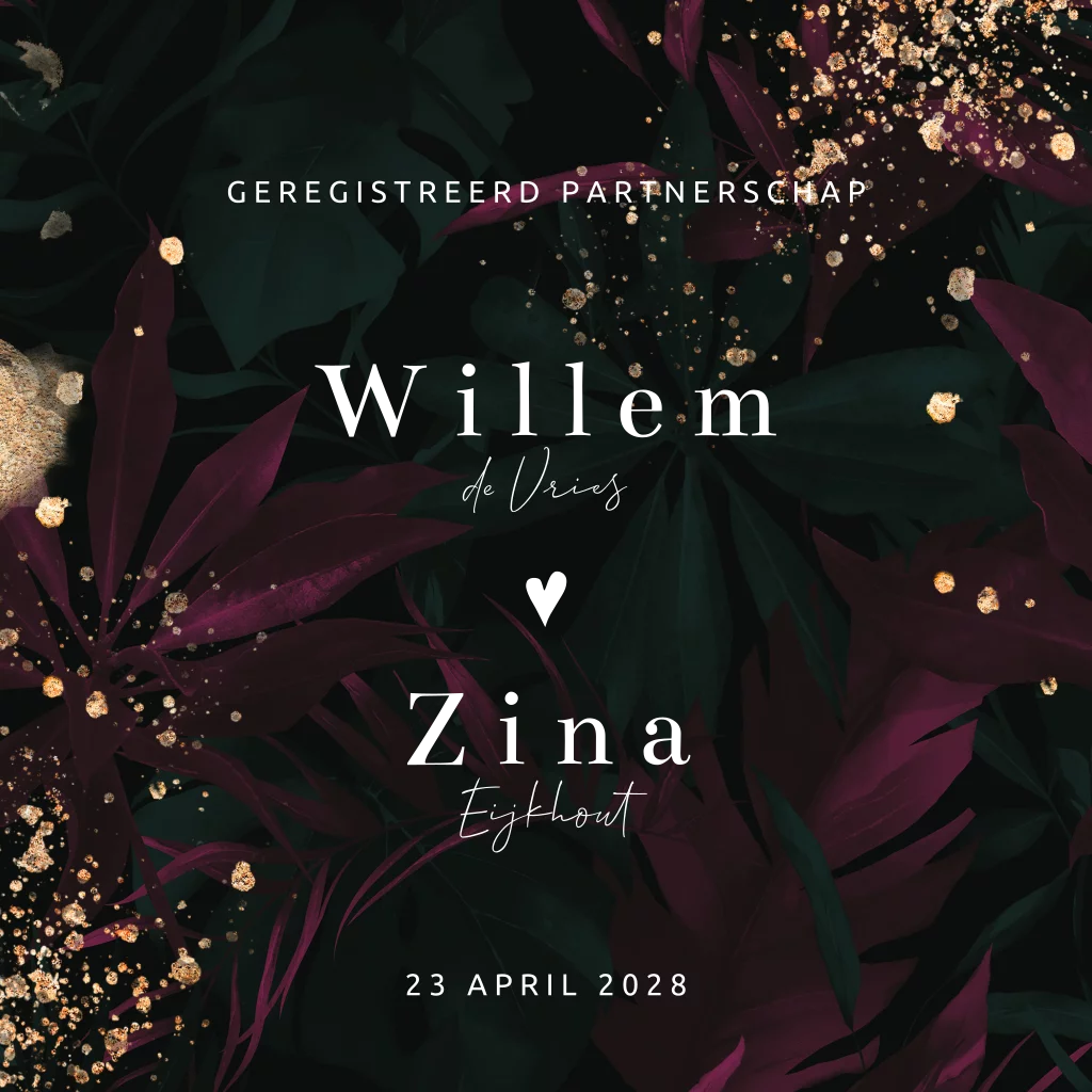 Geregistreerd partnerschap uitnodiging in luxe botanische sferen met glitters en donkerrode bladeren. De namen staan in glimmende goud folie. (24213)