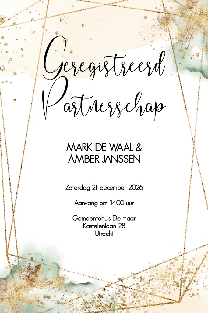 Geregistreerd Partnerschap Uitnodiging geometrisch met pastel groen en goudkleur. (8161)