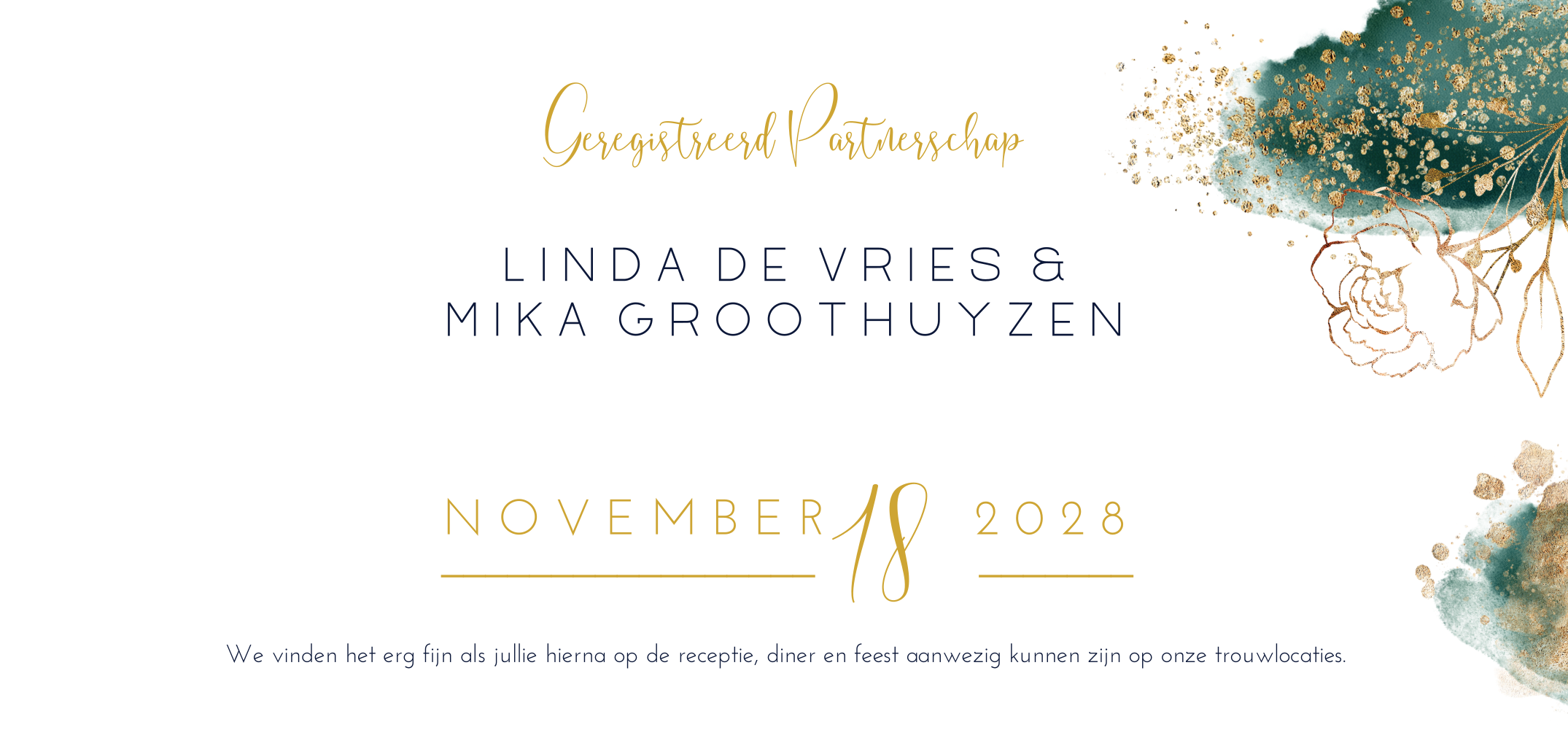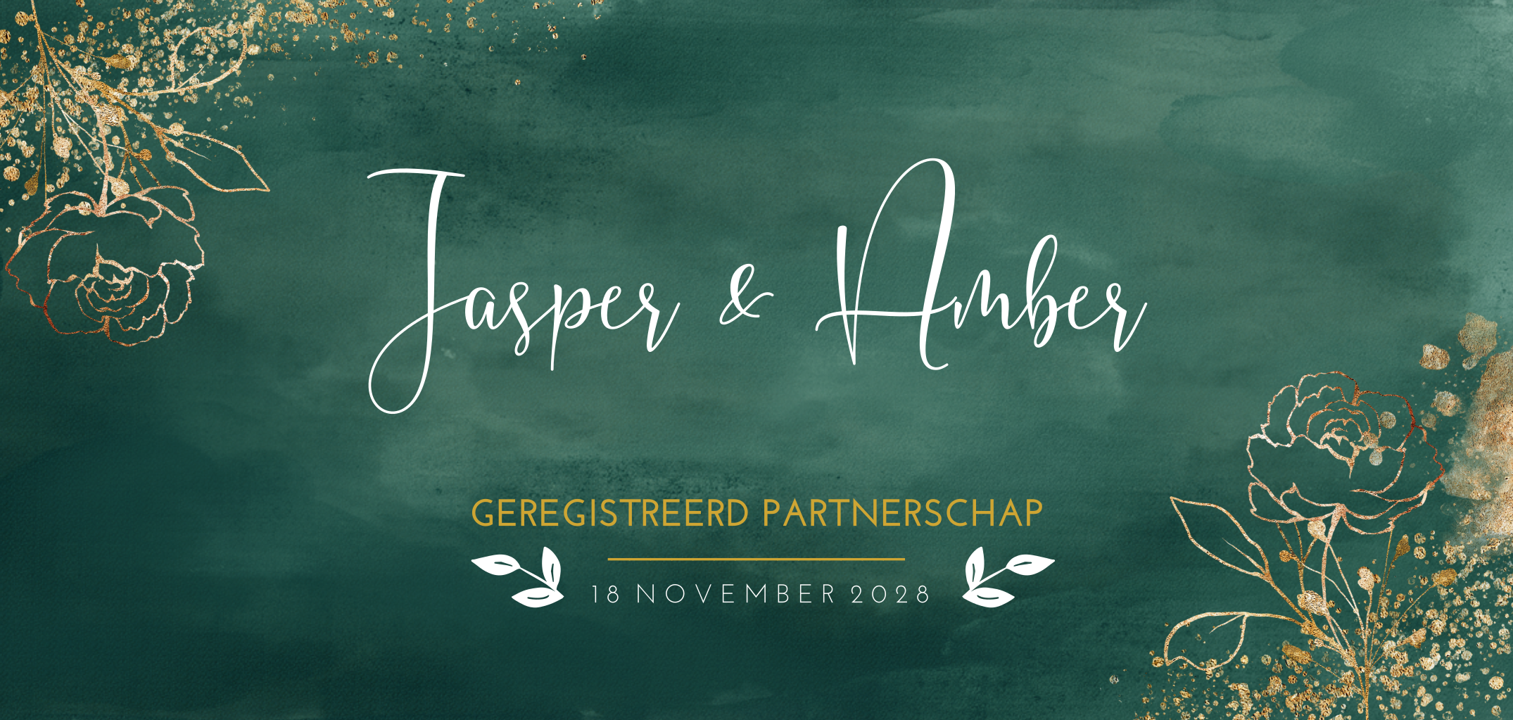 Mooie uitnodiging geregistreerd partnerschap in dubbel panorama formaat donker groen waterverf look met goudlook bloemen en goudlook spetters. Ook aan de binnenkant komt het groen en goud terug. (22508)
