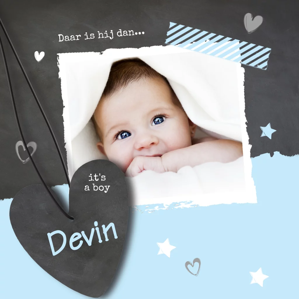 Jongens geboortekaartje blauwe witte verf met krijtbord. Met eigen foto en gestreept plakbandje. (1734)