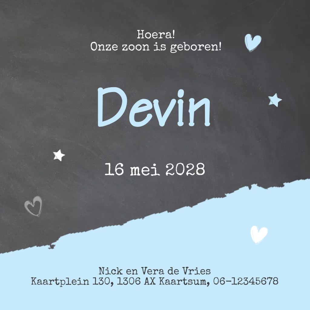 Jongens geboortekaartje blauwe witte verf met krijtbord