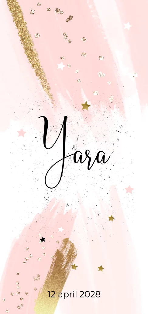 Hip geboortekaartje meisje met verfstrepen in lichtroze en goud en sterretjes. (9971)