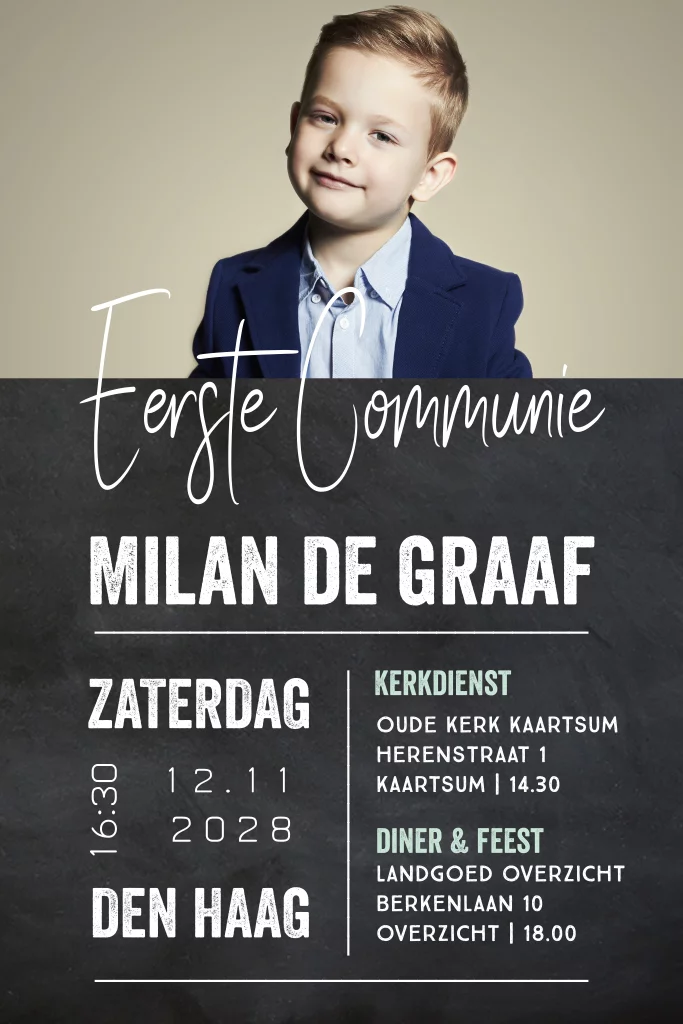 Hippe en moderne eerste communie uitnodiging met krijtbord en eigen foto. (22507)