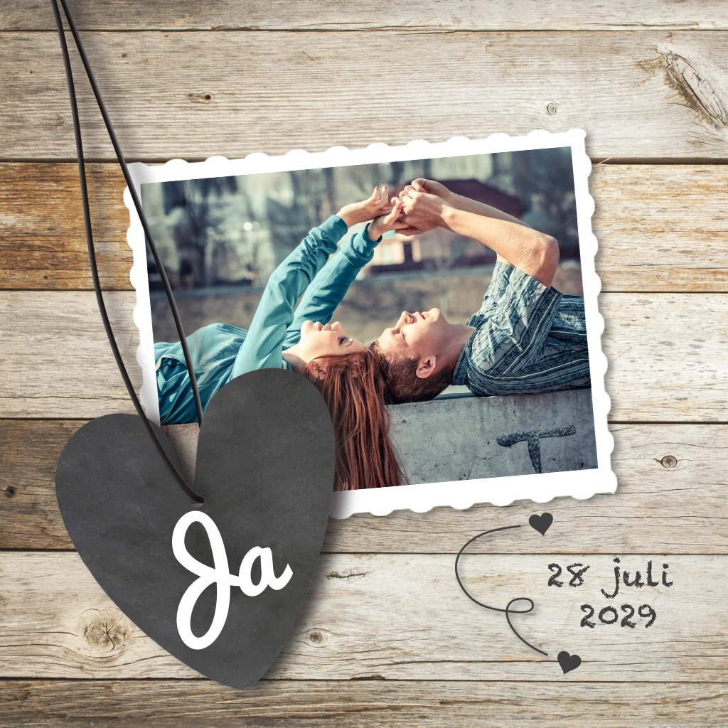 Leuke foto trouwkaart bruine houten planken en hart. (2017) trouwkaarten