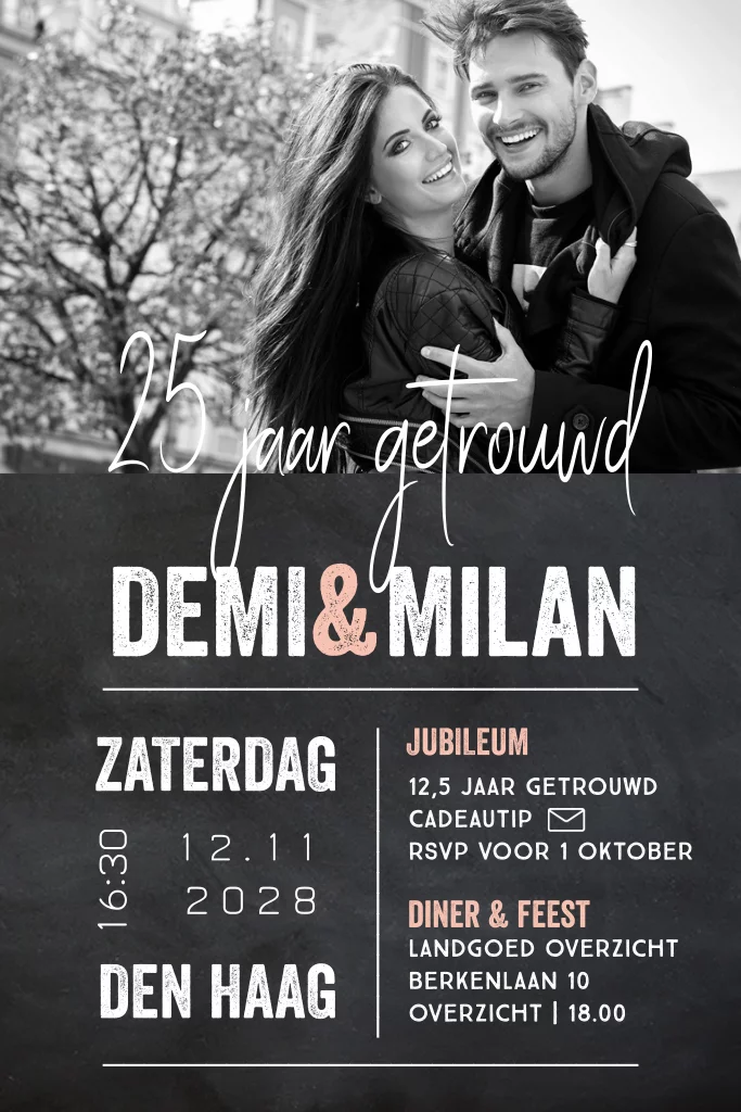 Hippe en moderne jubileum uitnodiging met krijtbord en eigen foto. (22507)