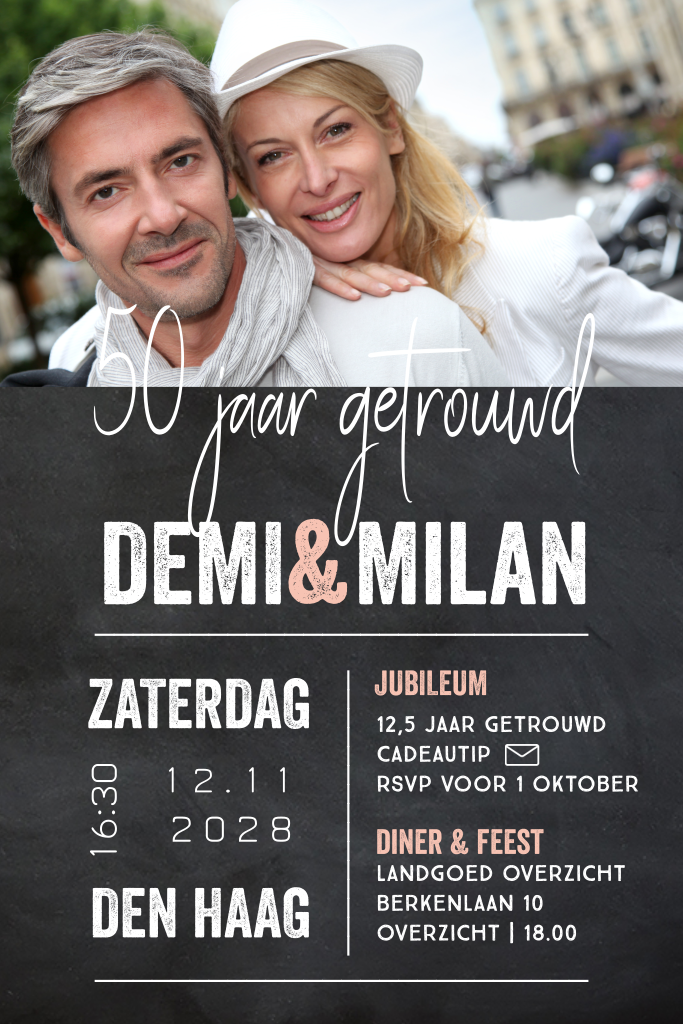 Hippe en moderne jubileum uitnodiging met krijtbord en eigen foto. (22507)