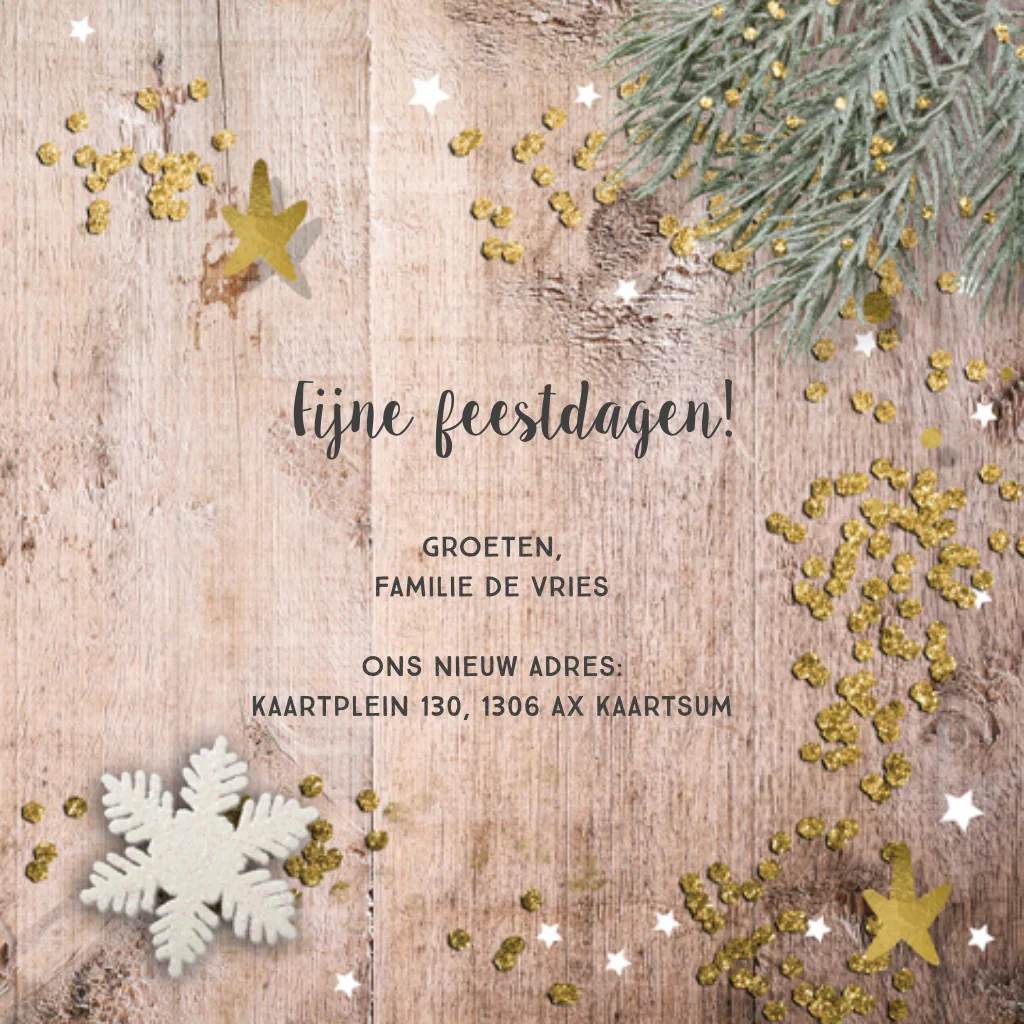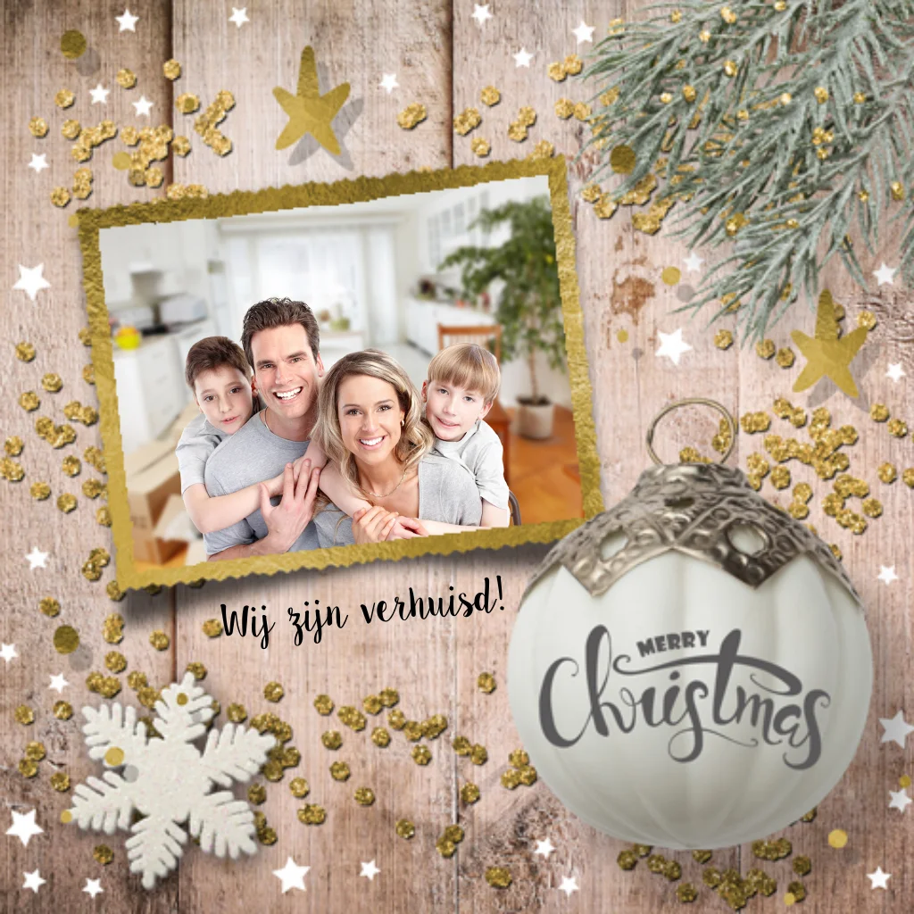 Hippe kerst verhuiskaart met foto hout en kerstbal. (7814)