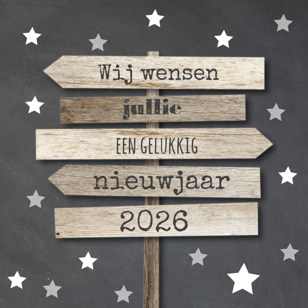 Hippe nieuwjaarskaart krijtbord wegwijs hout. (2107)