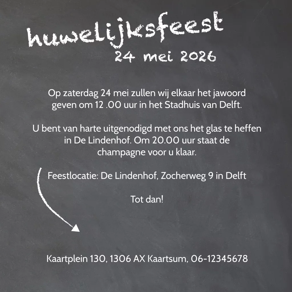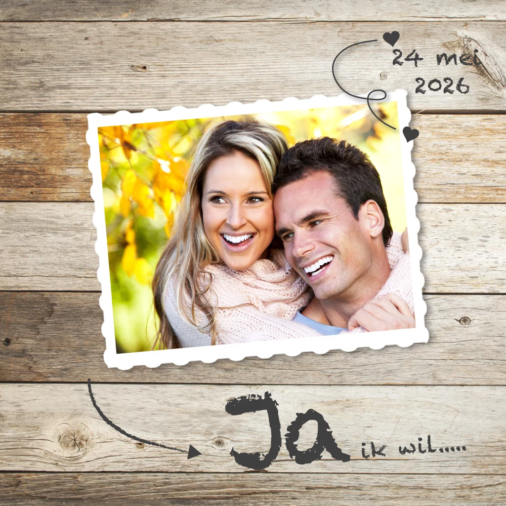 Foto trouwkaart bruin hout met foto en krijtbord. Met diverse trendy krijtversieringen. (2016)