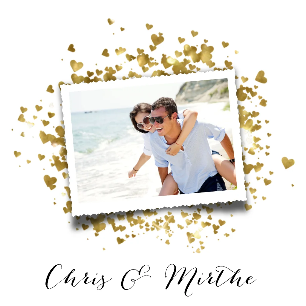 Voordelige trouwkaart met goudkleurig hartjes regen en foto. (6444)