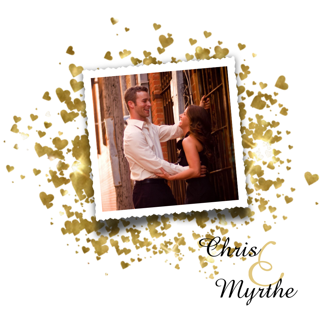 Hippe trouwkaart met goudkleurig hartjes en foto.