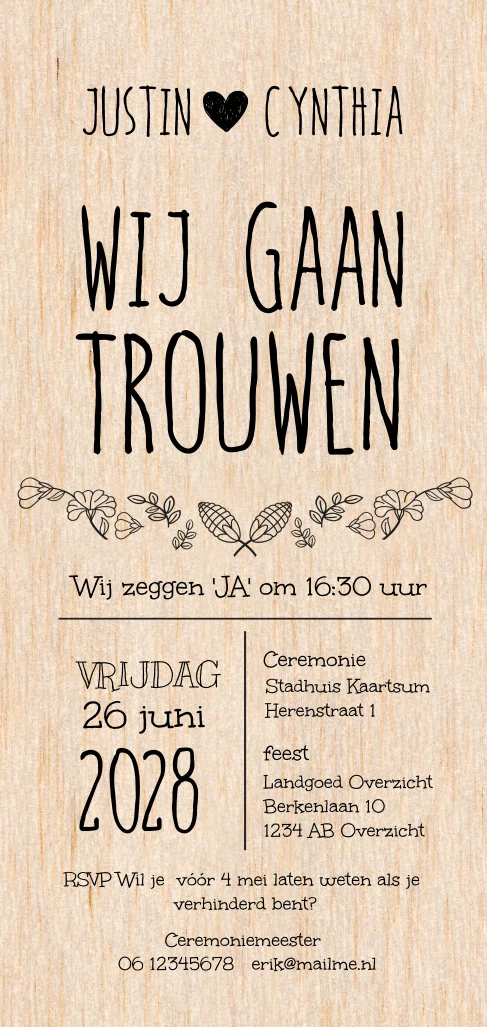 Hippe typografie trouwkaart in langwerpig formaat op echt hout. (88888)