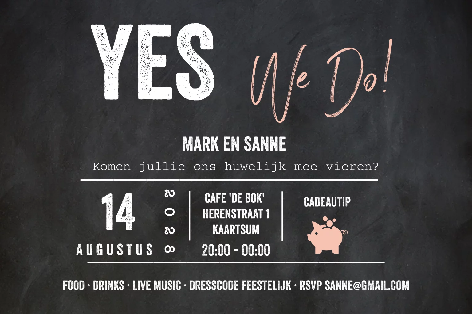 Stoere trouwkaart met leuke teksten YES WE DO op zwarte krijtbord achtergrond. (9922)