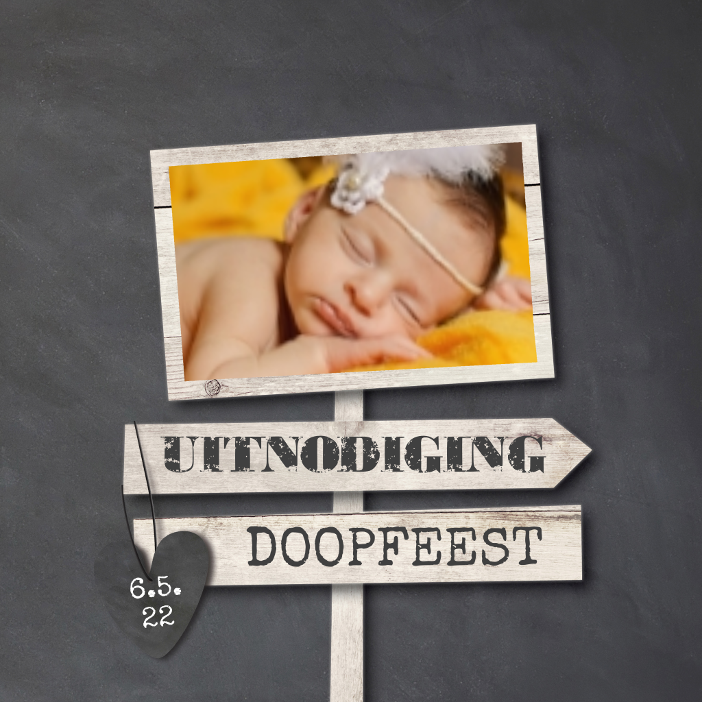 Hippe uitnodiging voor doopfeest met ruimte voor een eigen foto. Op de achtergrond een mix van krijtbord en hout. Kan voor een jongen en meisje gebruikte worden. (7285)