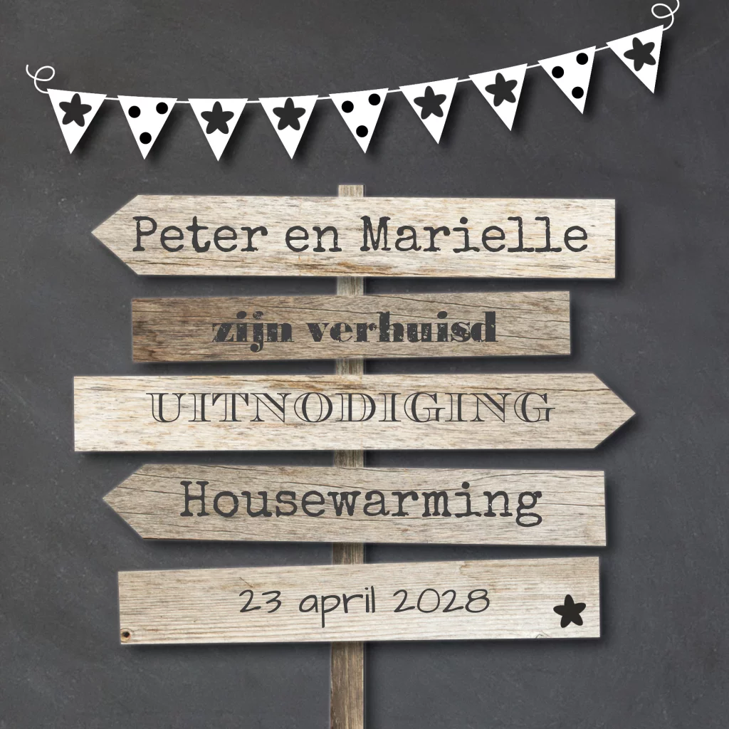 Hippe verhuiskaart schoolbord slinger wegwijzer hout. (2632)