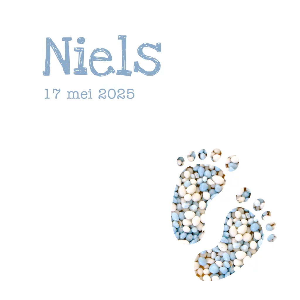 Leuk geboortekaartje voor een jongen met voetjes van wit met blauwe beschuit met muisjes. (3345)