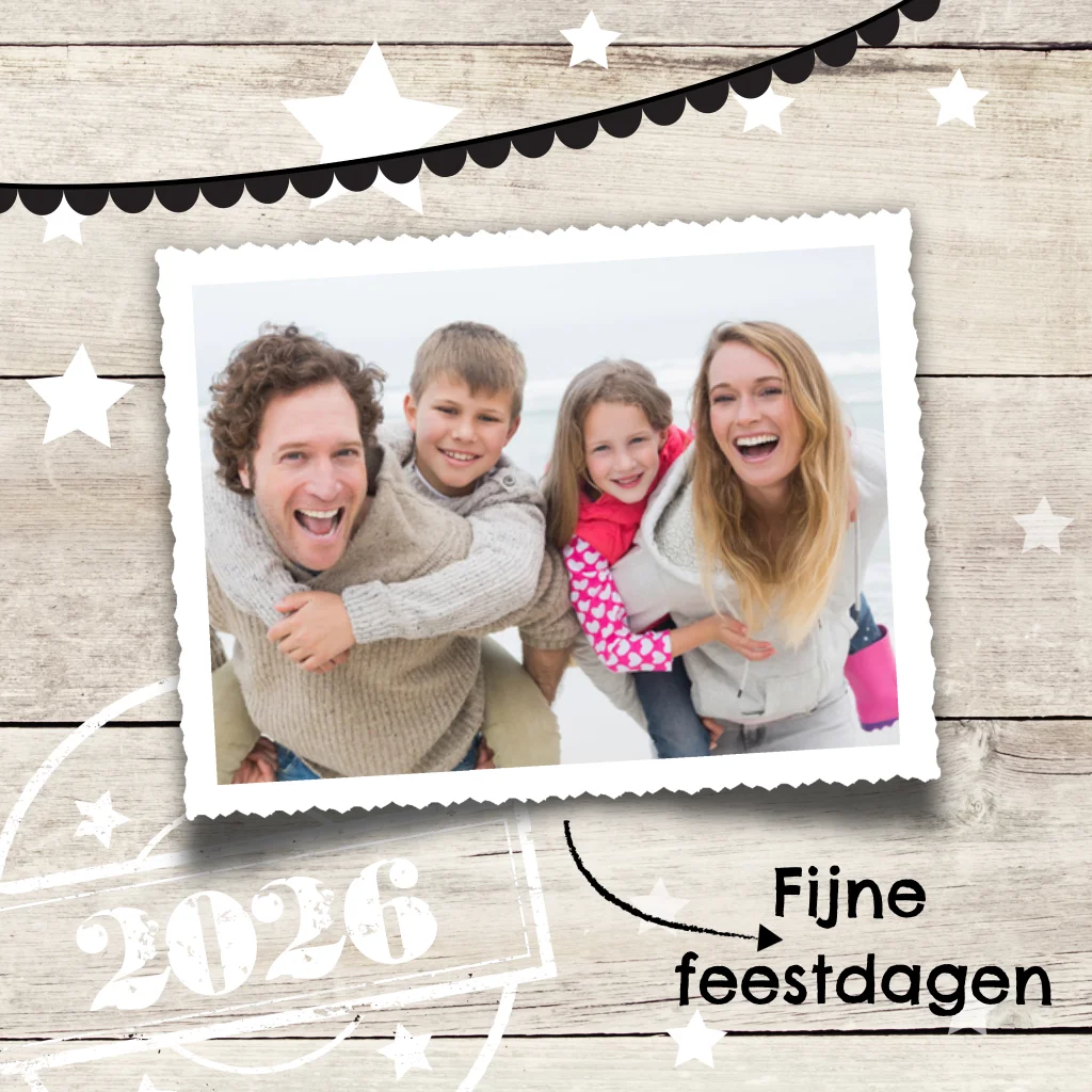 Houten kerstkaart met foto slingers sterren en stempel jaartal. Hippe kaart voor jullie mooiste nieuwjaarswensen. (2285)