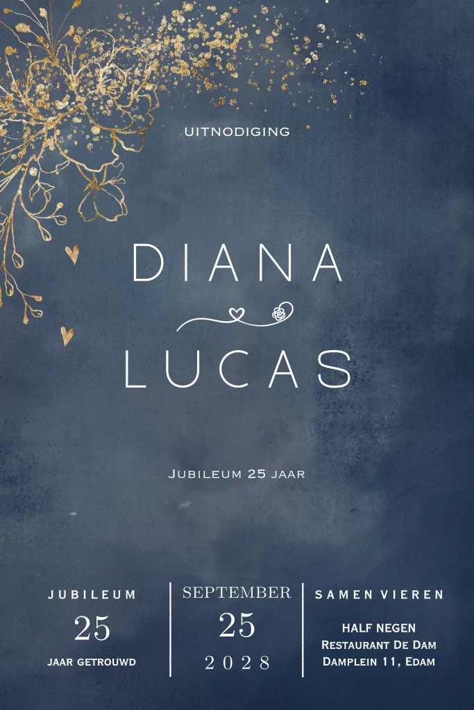 Jubileum 25 uitnodiging blauw met goudkleurige bloemen