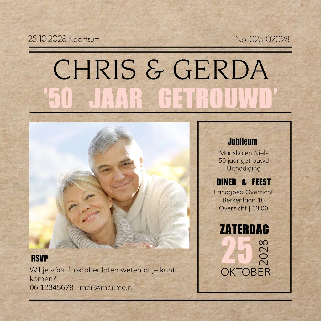 Uitnodiging 50 jaar getrouwd met kraft look en eigen foto