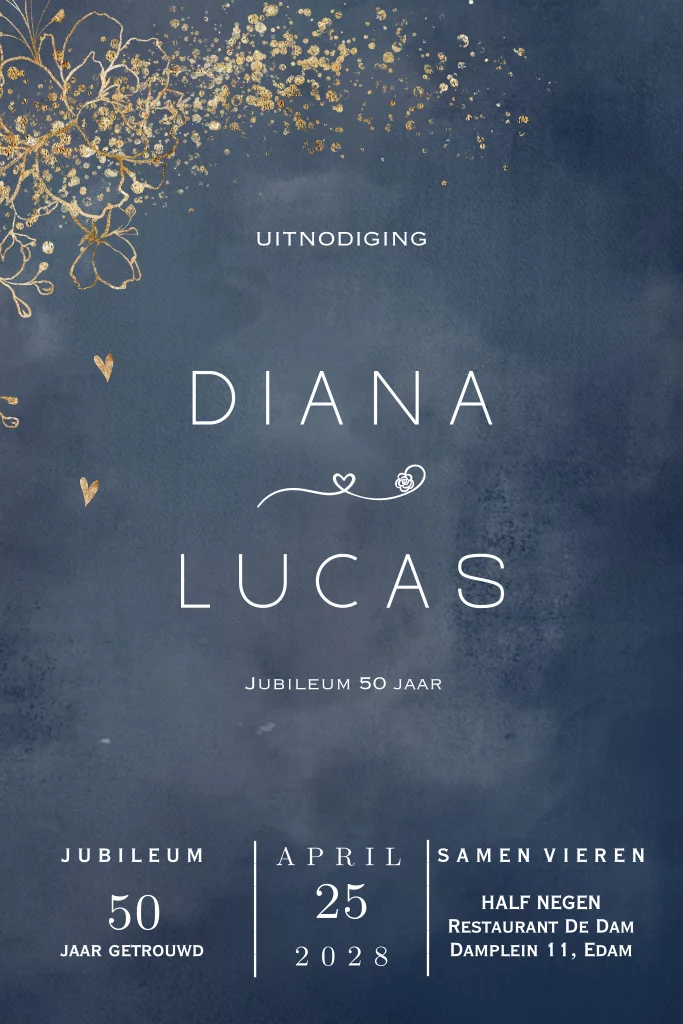 Jubileum 50 jaar uitnodiging blauw met goudkleurige bloemen