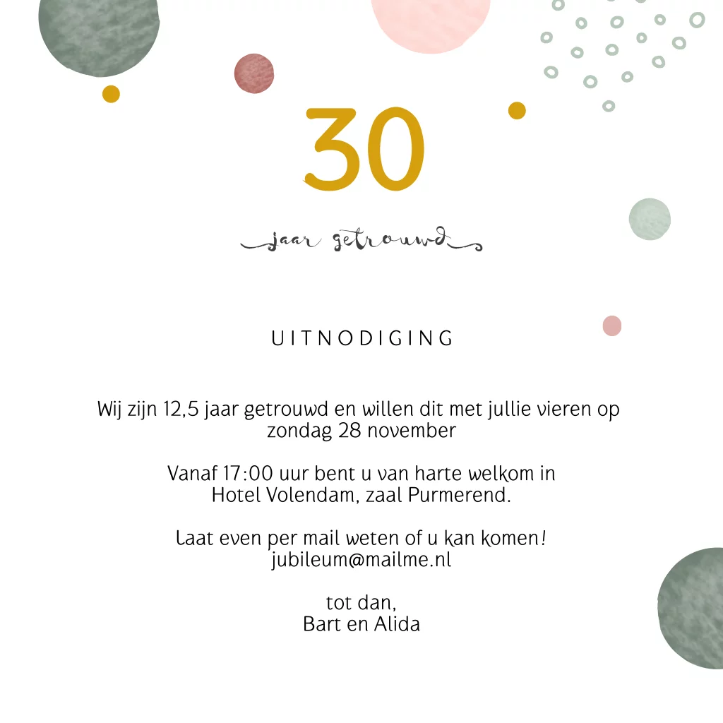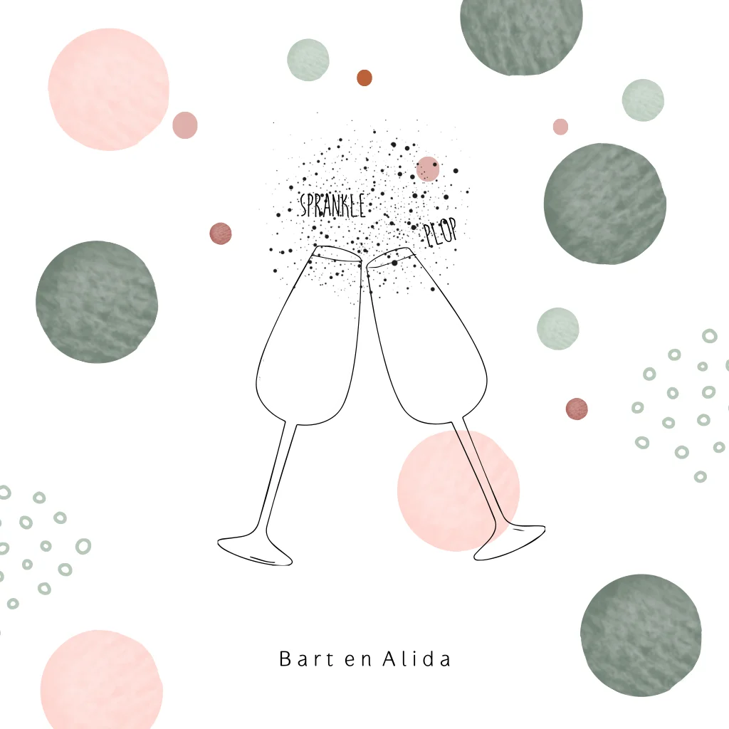 Uitnodiging 40 jaar getrouwd met grote cirkels in roze en groen. Champagne glazen en foliedruk. (23035)