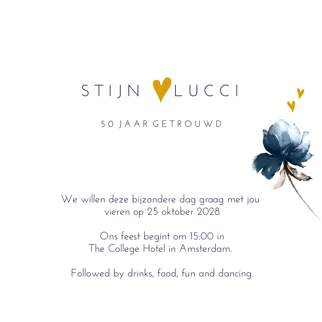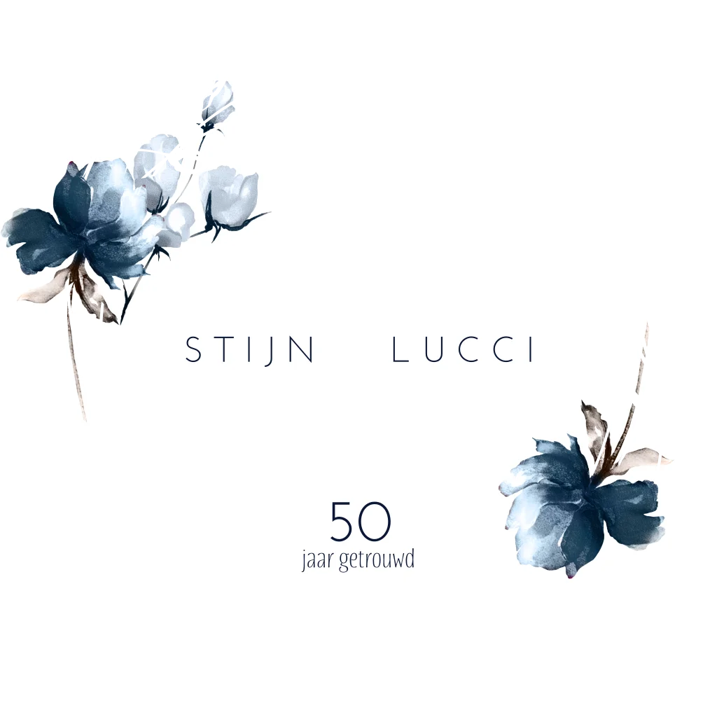 50 jaar getrouwd uitnodiging met goudfolie namen en hart en een mooie krans / ring met bloemen in blauw. (22511)