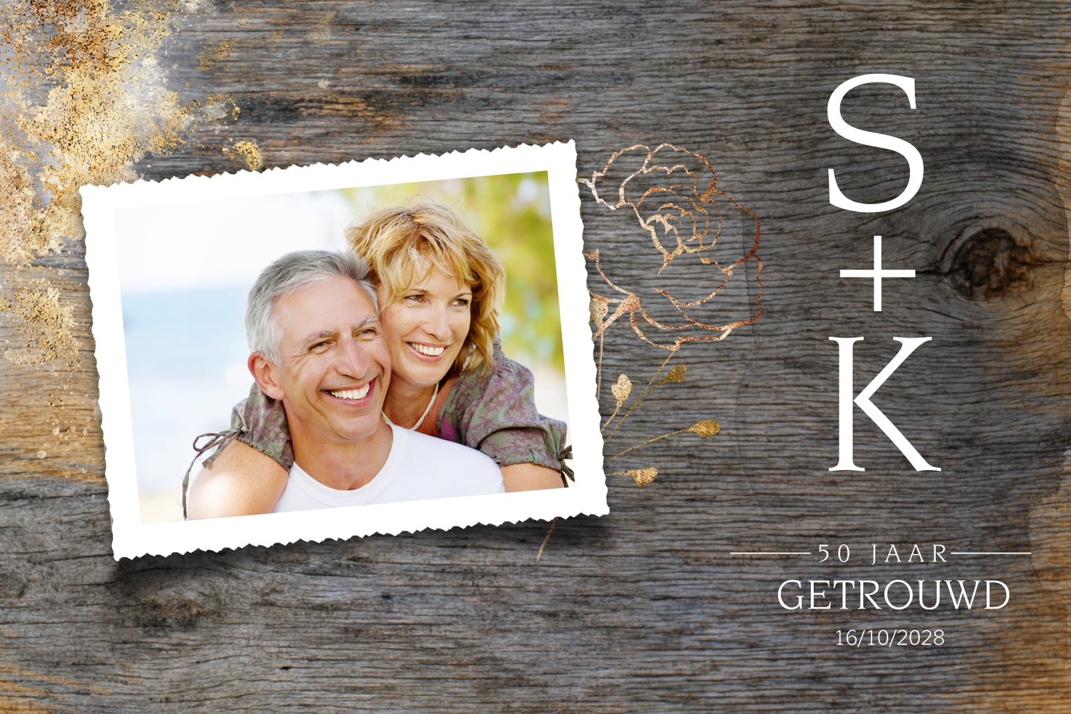 Jubileum uitnodiging met eigen foto, hout kleurige achtergrond en koper kleurige versiering. (22576)