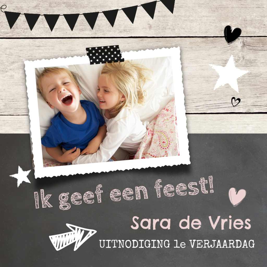 Enkele hippe foto uitnodiging voor een kinderfeestje 1e verjaardag meisje. Met fotokader, krijtbord, hout print, slinger, sterren en hartjes. (2729)
