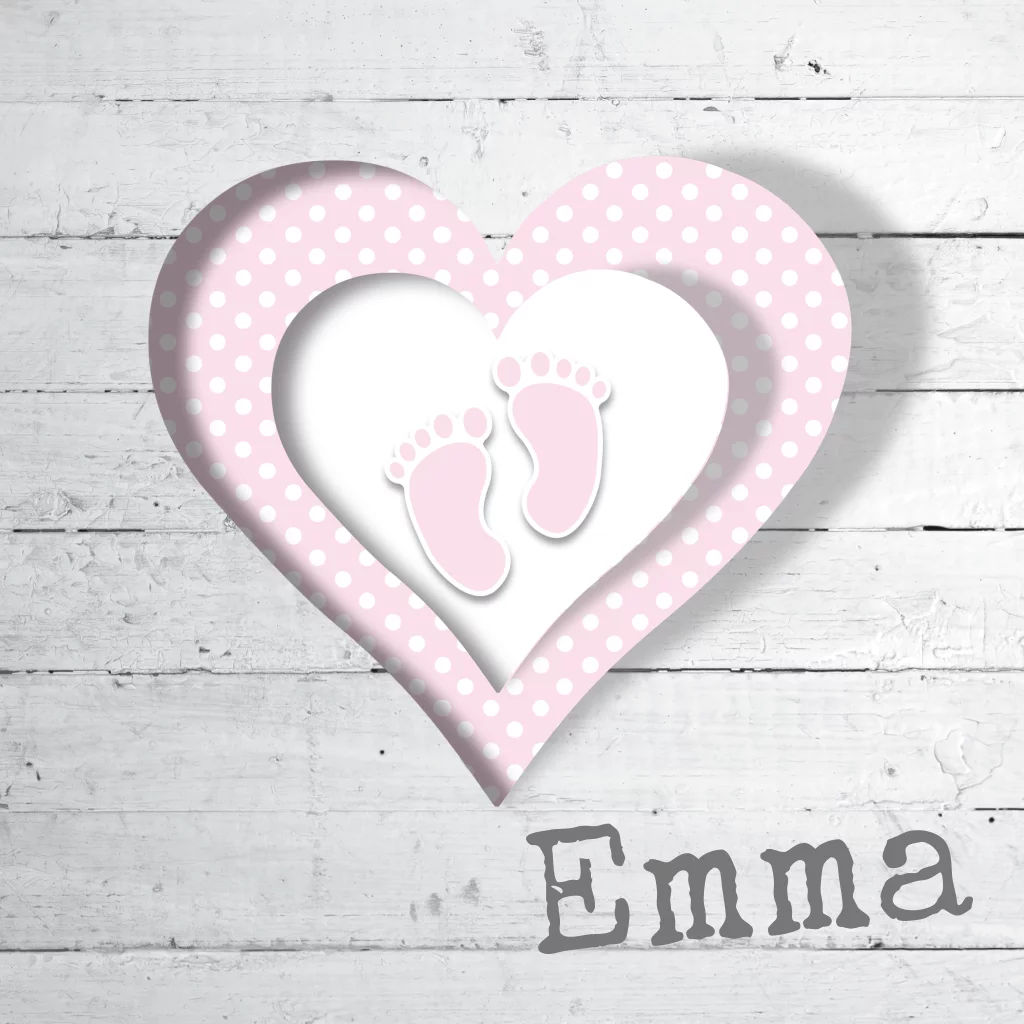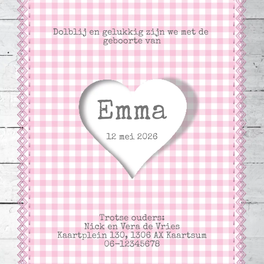 Klassiek geboortekaart meisje met ruitjes hart stippen en voetjes. Op hout-look achtergrond met de kleuren roze en grijs (1705) Geboortekaartje Emma
