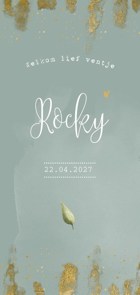 Langwerpig hip geboortekaartje voor een jongen met waterverf en goudkleurige details. (7417)