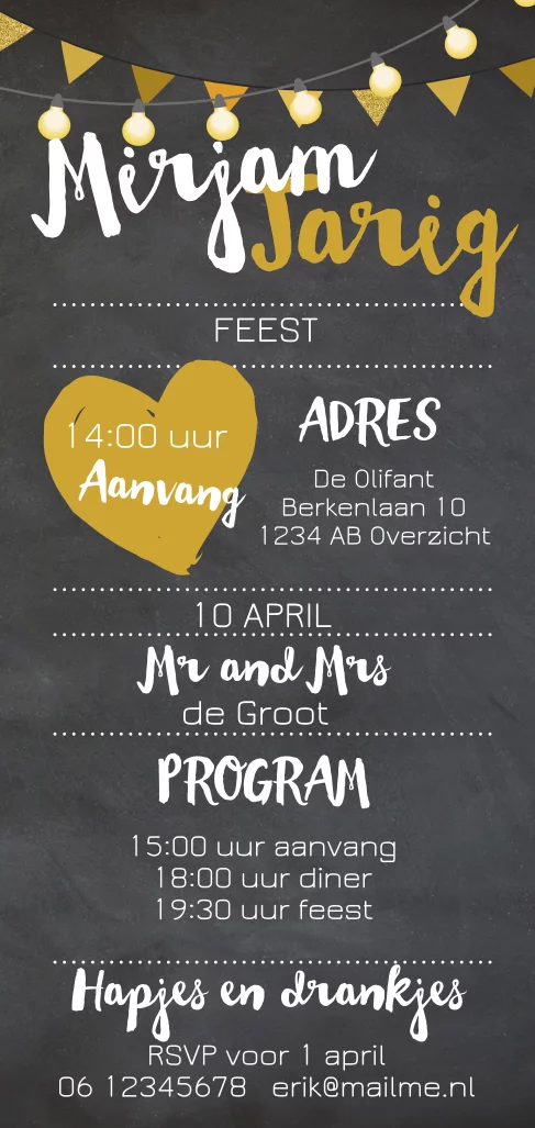 Langwerpige staande uitnodigingskaart met lichtsnoer. Op donker grijze krijtbord achtergrond. (5374)
