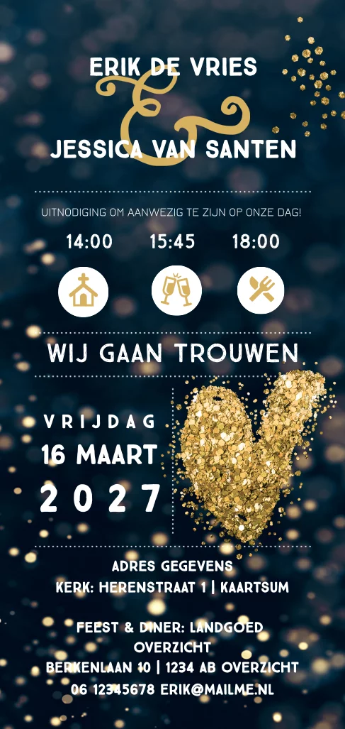 Moderne langwerpige trouwkaart met goudkleurige confetti op een donker blauwe achtergrond (6464)