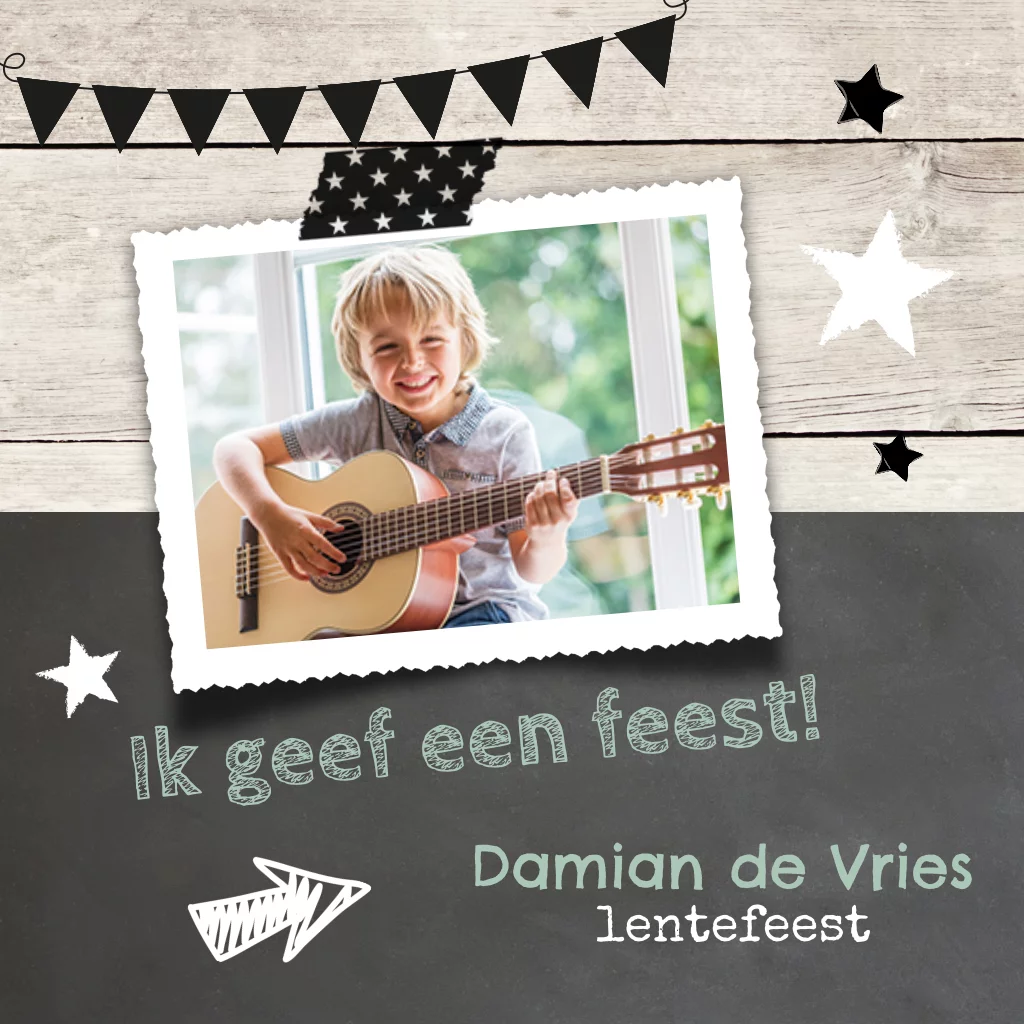 Enkele hippe foto uitnodiging voor een lentefeest jongen. Met fotokader, krijtbord, hout print, slinger, sterren en hartjes. (2730)