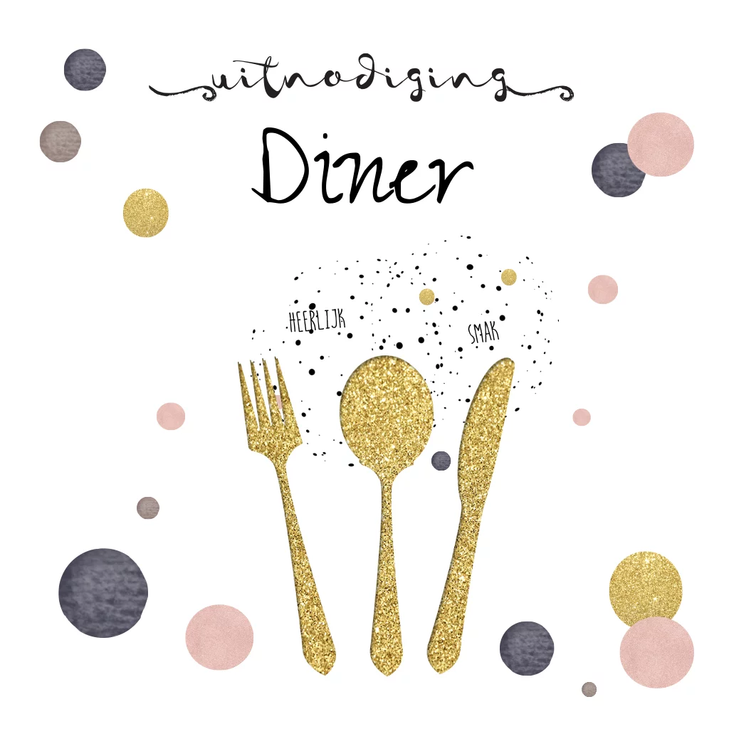 Leuke uitnodiging kaart diner etentje met gouden bestek en confetti