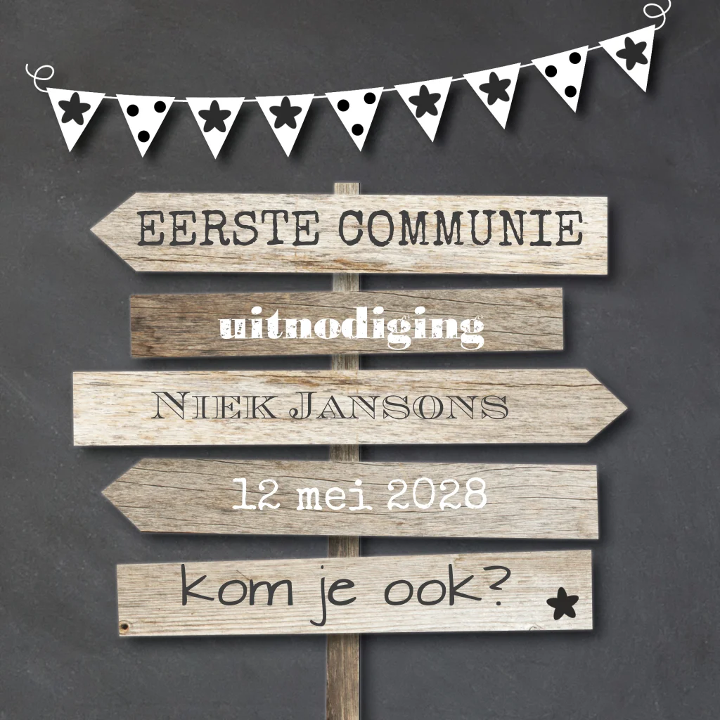 Modern communiekaartje uitnodiging dienst met oude wegwijs borden op een krijtbord achtergrond. Kan voor een jongen en meisje gebruikt worden. (7287)