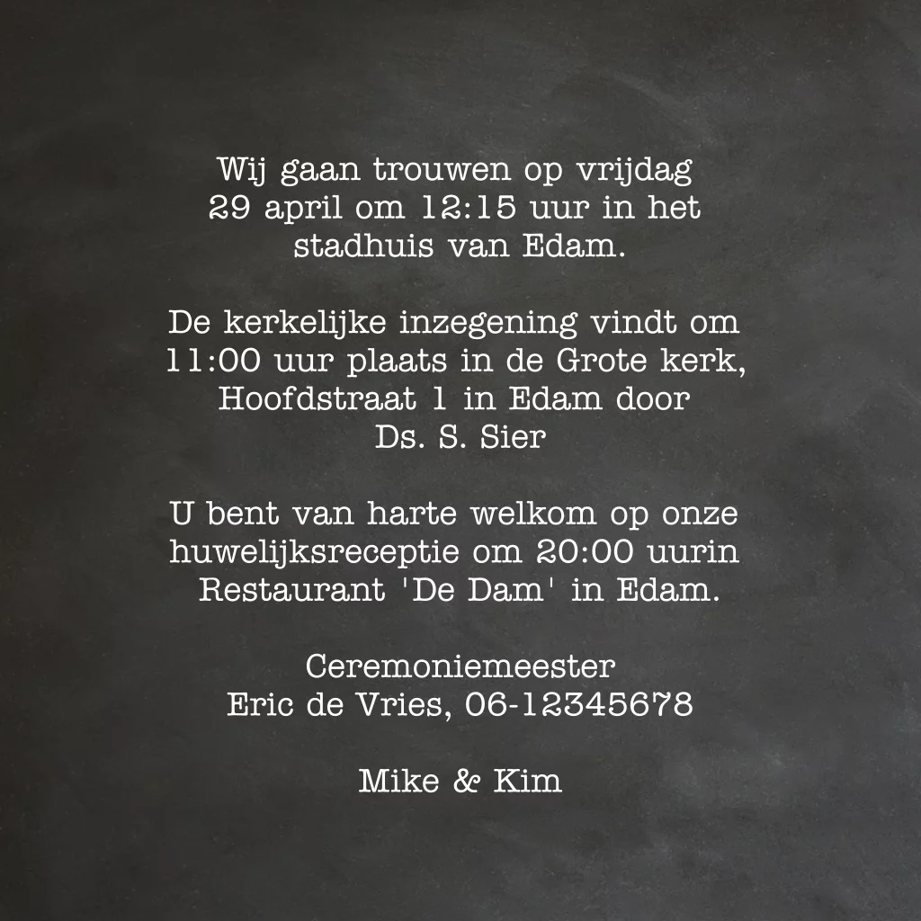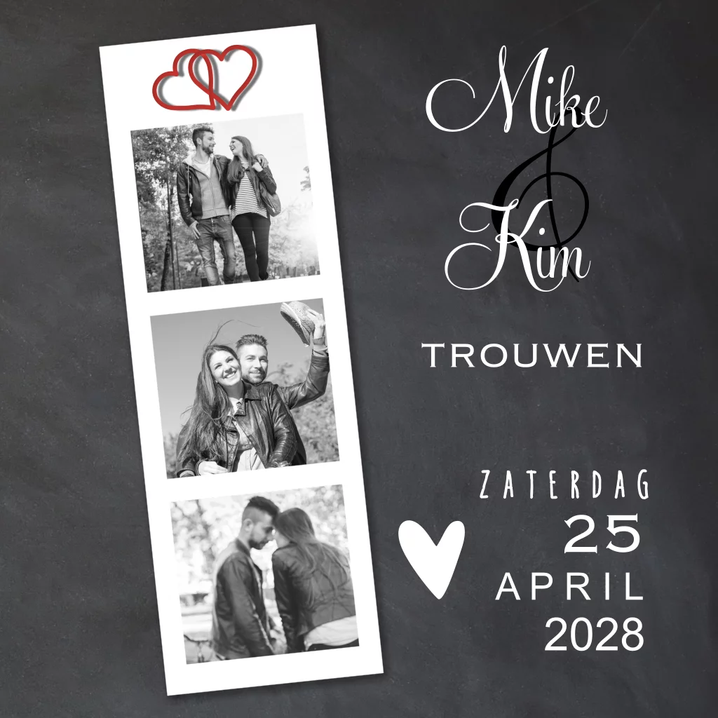 Moderne trouwkaart met fotostrip en zwarte achterkant