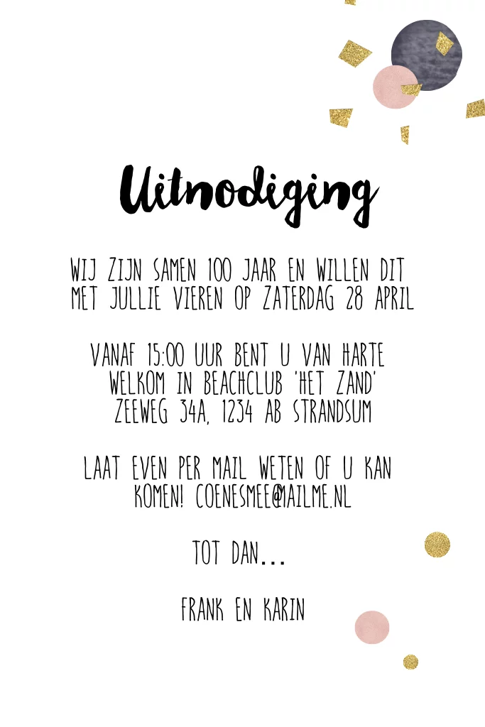 Hippe trendy uitnodigingskaart met goudkleur, paars en roze confetti. Met goud gekleurde accenten. (5276)